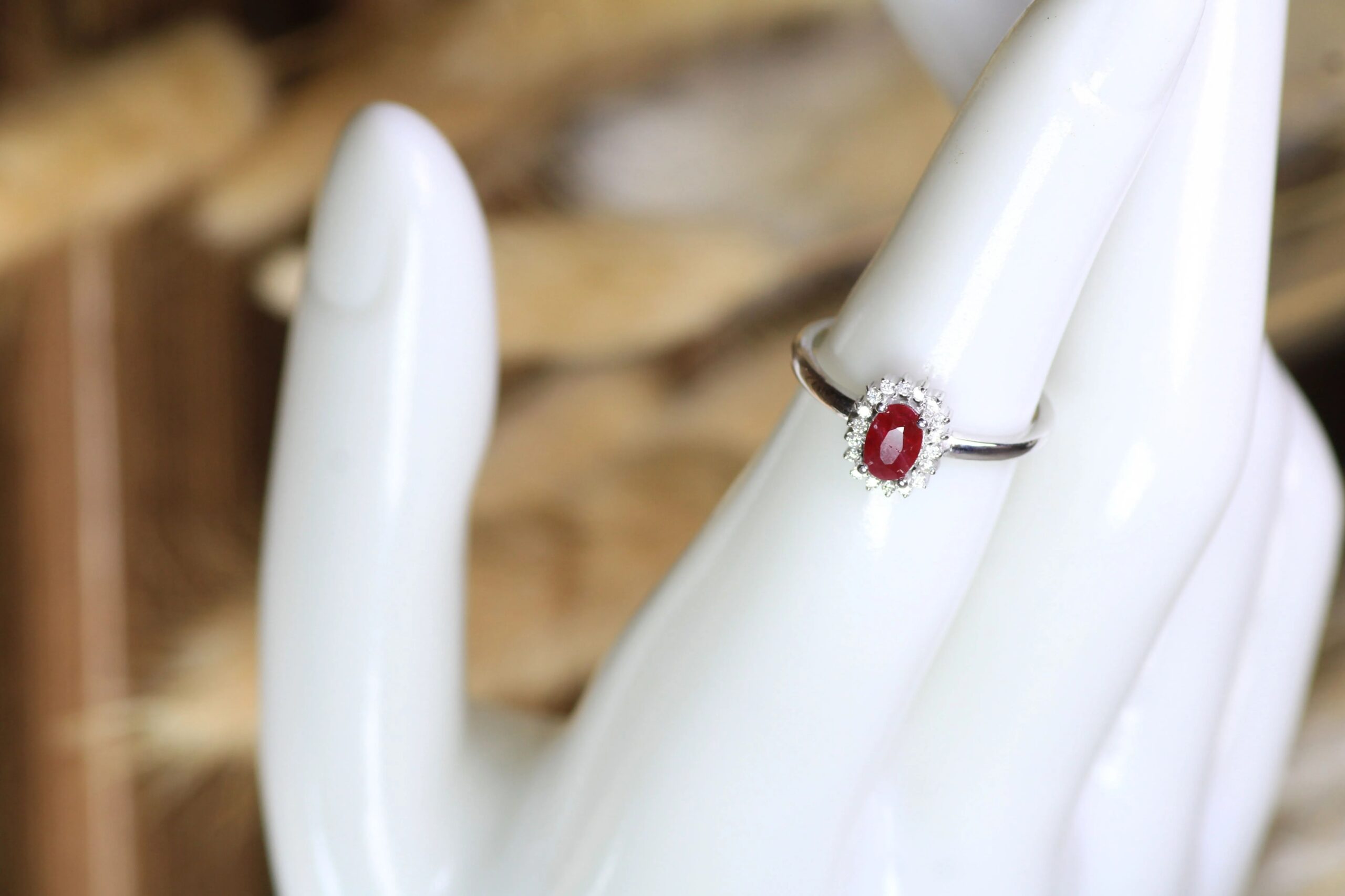 El Anillo Rubi Lady Di Oval Diamantes Oro Blanco Talla 6 es una pieza icónica que transmite elegancia y romanticismo, ideal para un regalo memorable o para darte el lujo de portar una joya que realza cualquier look con su brillo clásico y sofisticado.