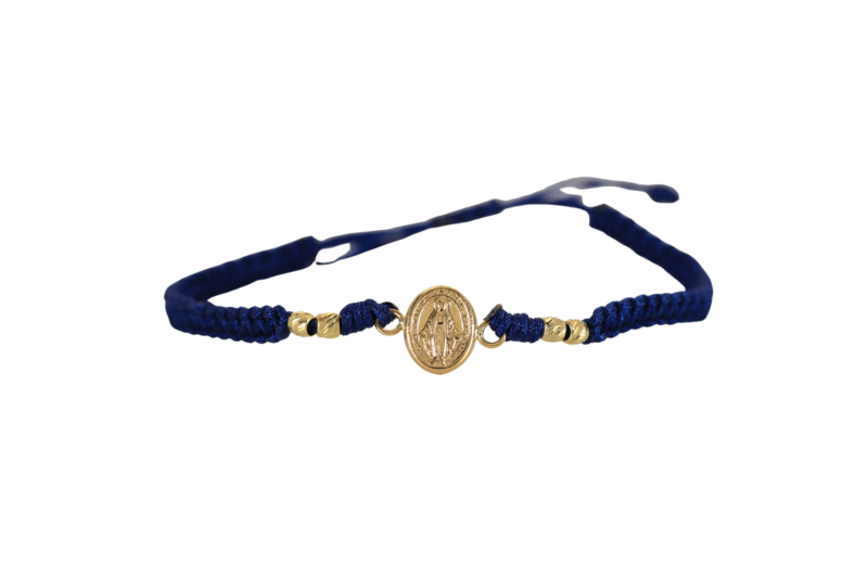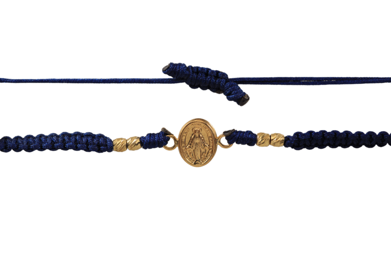 Brazalete tejido azul Virgen Milagrosa 9.8mm x 14.2mm x 1.9mm. Un diseño lleno de fe y estilo. Este brazalete tejido en color azul destaca con un herraje de la Virgen Milagrosa en oro de 18 kilates, un símbolo de protección y esperanza que puedes llevar siempre contigo. Una joya especial para complementar tu estilo o sorprender a alguien especial.