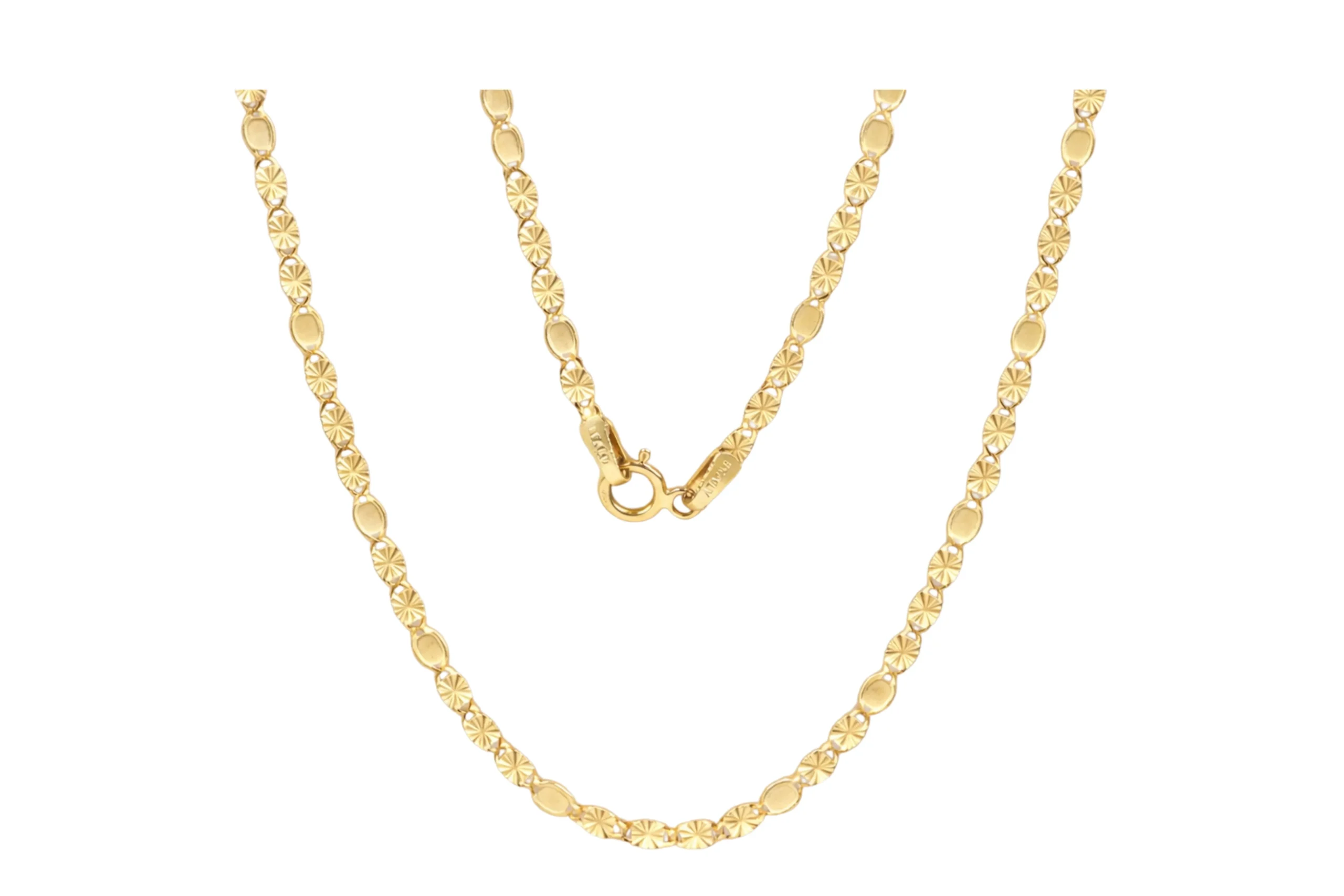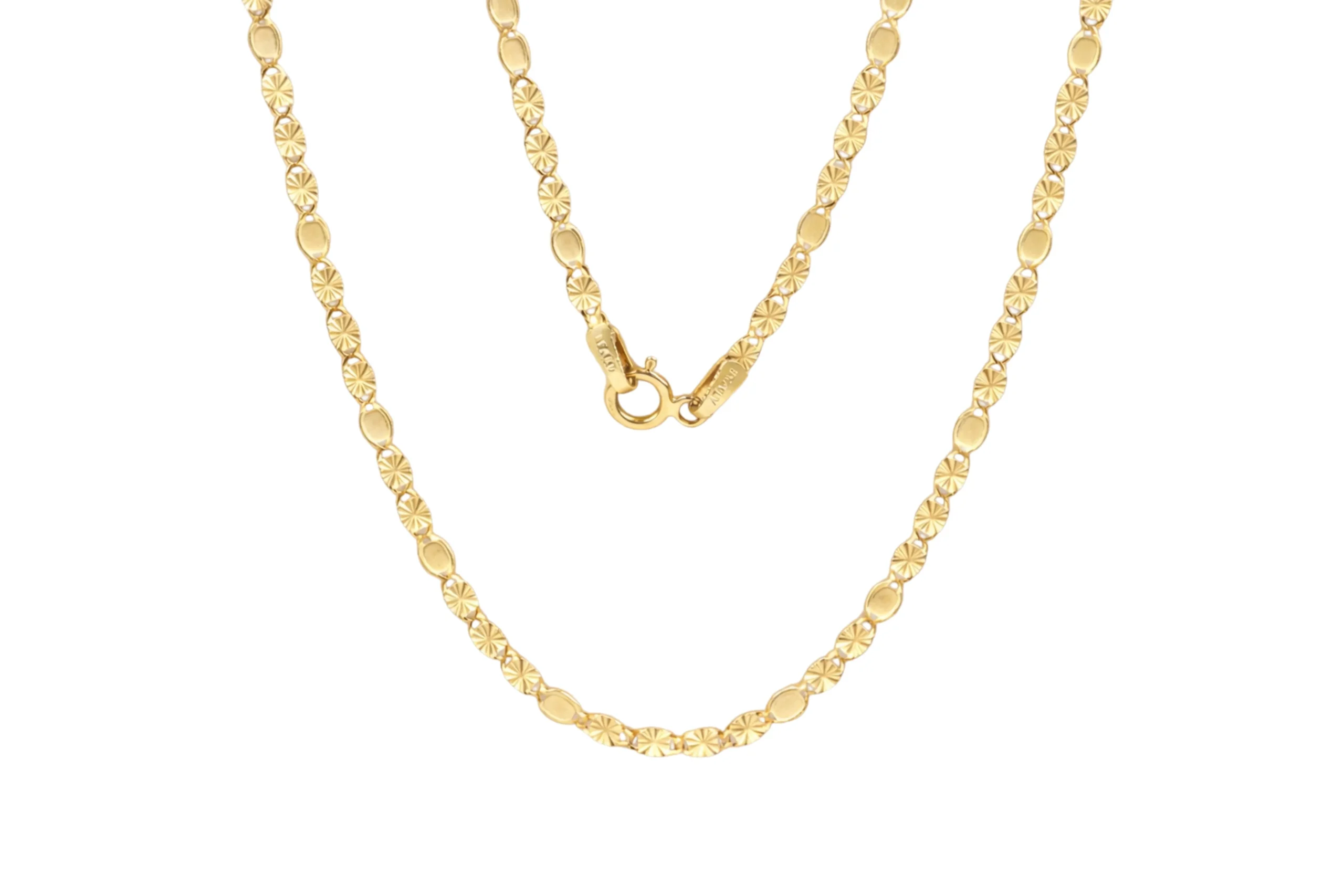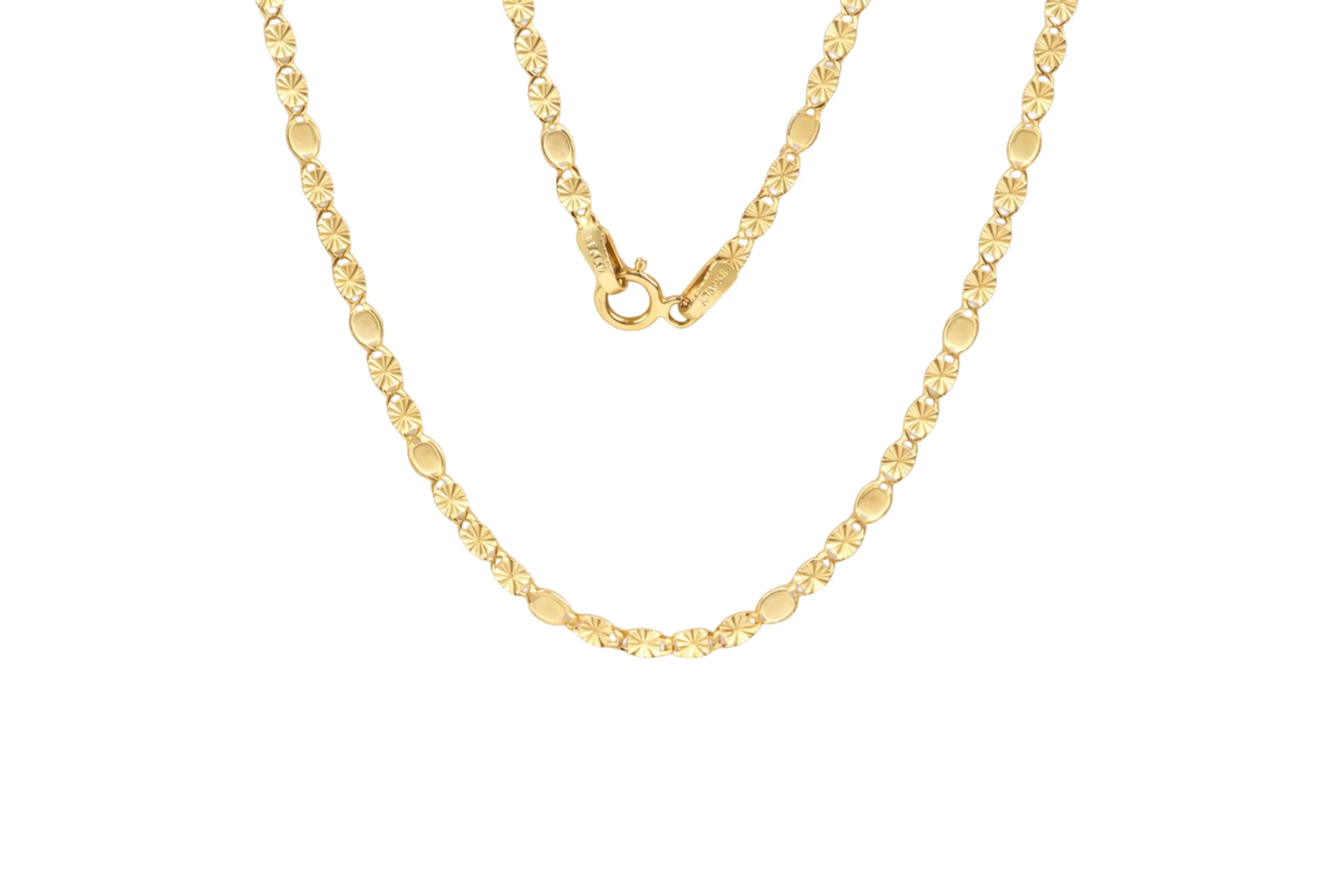 Una joya sofisticada con diseño distintivo. La Cadena Crispeta Valentino en oro de 18 kilates de 45cm con 2mm y 0,2mm destaca por su tejido elegante y proporciones estilizadas. Elaborada cuidadosamente, ofrece brillo uniforme, estructura firme y comodidad para el uso diario. Perfecta para llevar sola o acompañar con dijes, es una cadena pensada para perdurar con elegancia.