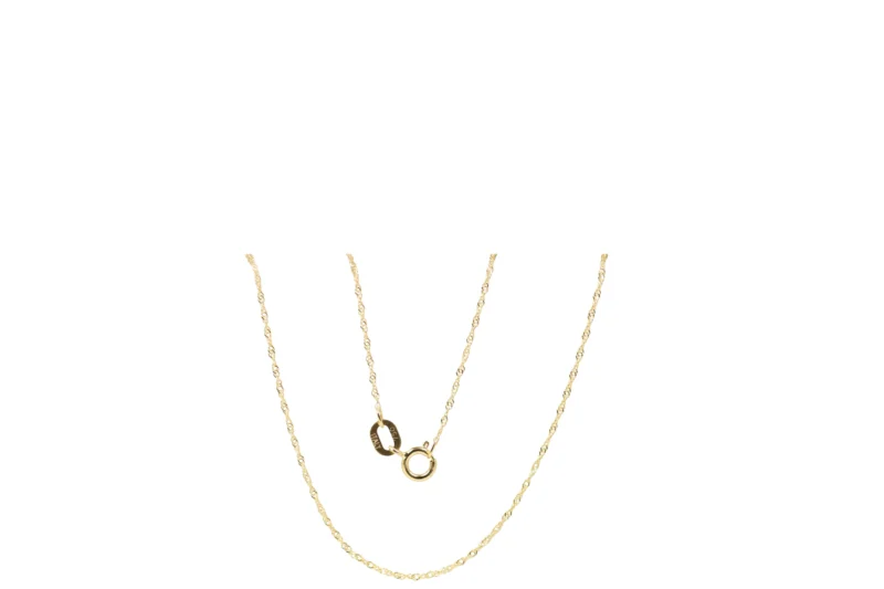 Fina y delicada, la Cadena Singapur 45cm-0,7mm destaca por su trenzado distintivo que refleja la luz con cada movimiento. Perfecta para usar sola o con dijes pequeños, realza cualquier look con discreto encanto y sutileza.