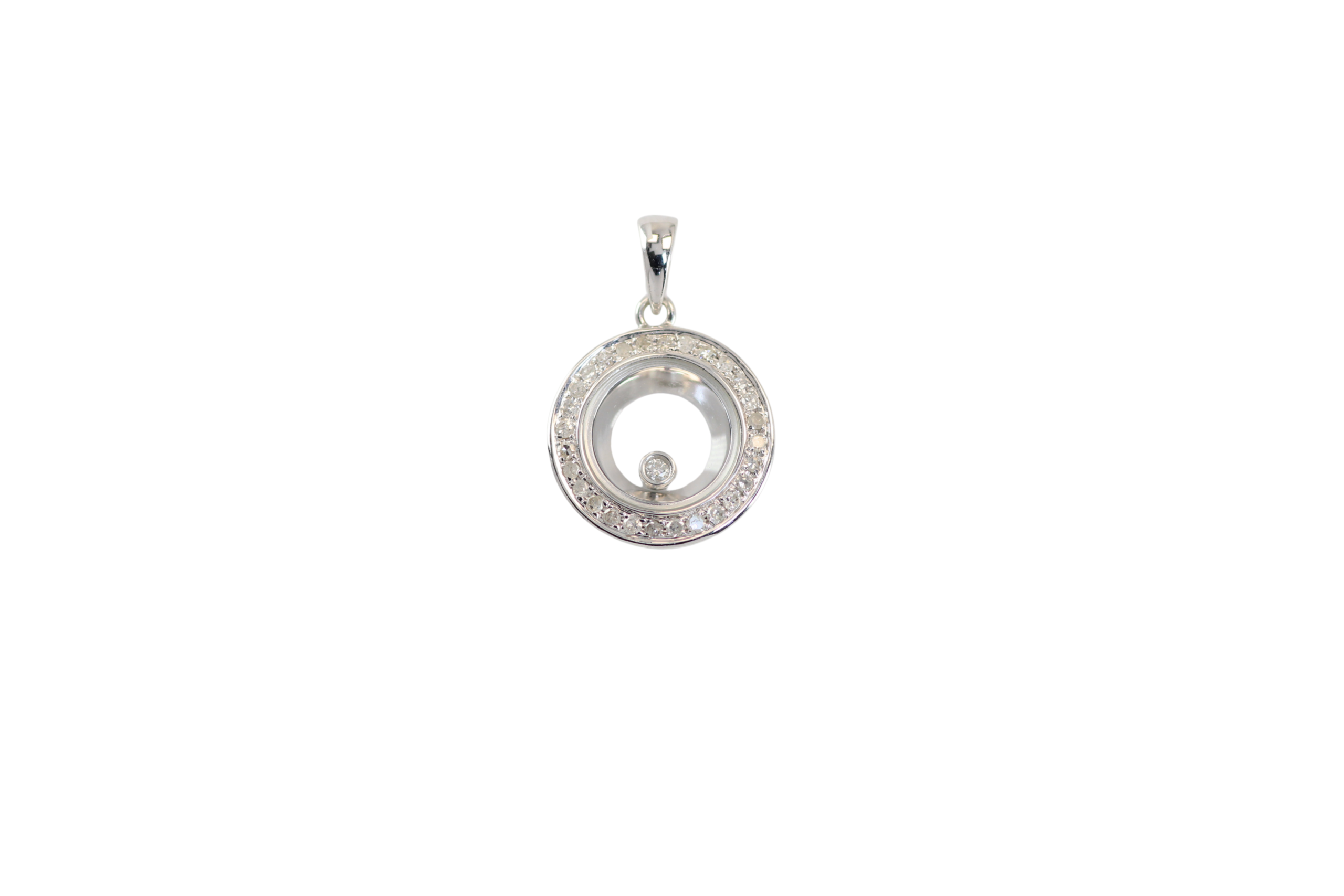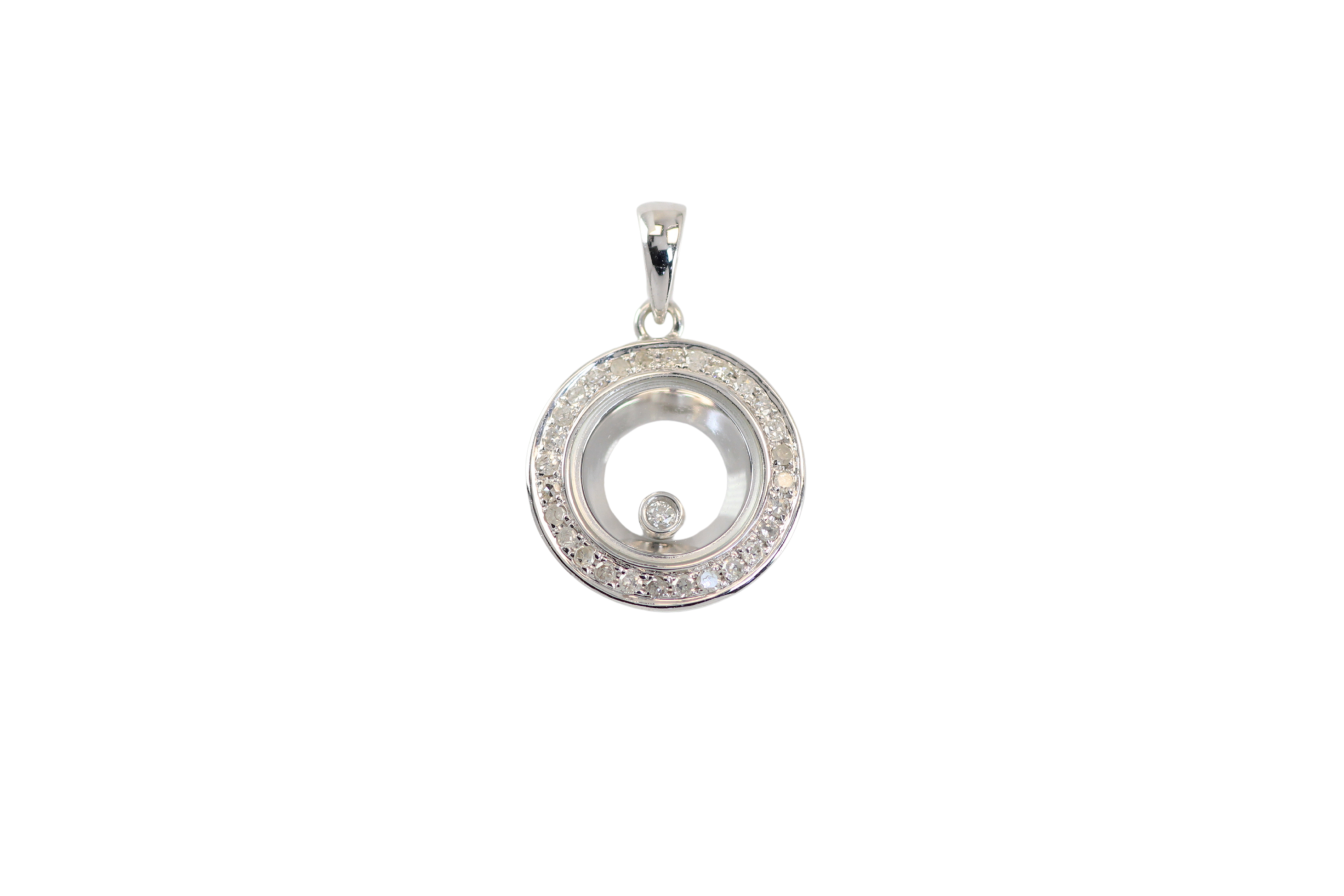 El Dije Chopard Circular Happy Diamonds de 14,8 mm x 12,8 mm con grosor de 3,2 mm completa la selección con un diseño moderno y armonioso. Una pieza exclusiva que refleja movimiento y estilo en cada detalle.